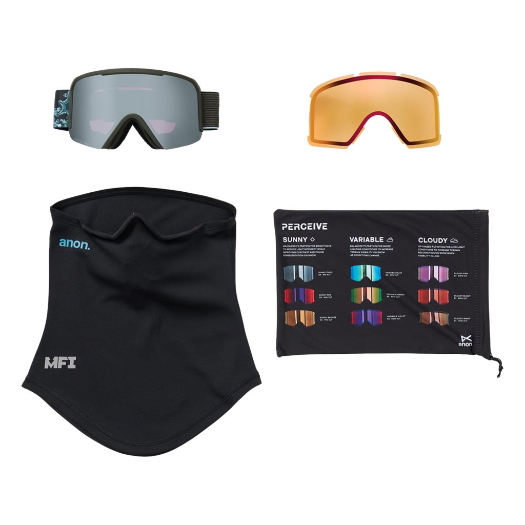 The Anon Nesa Goggles combine a sleek, modern profile with a wide field of view and the clarity of Perceive lens technology. A cylindrical lens and semi-frameless design maximize the field of view, while Perceive lens technology enhances contrast for the best possible definition and terrain recognition. They feature our exclusive magnetic face mask integration (MFI®) for seamless coverage from snow, wind, and sun when used with our compatible hoods and face masks. They are over the glass compatible for wearing with eyeglasses and include two Perceive lenses, a mesh MFI face mask, plus a microfiber bag for storage and lens cleaning.