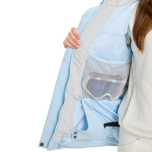 Pockets: 2 zippered handwarmer pocket with key clip, chest pocket with media port, Sleeve pass pocket, Internal mesh goggle pocket